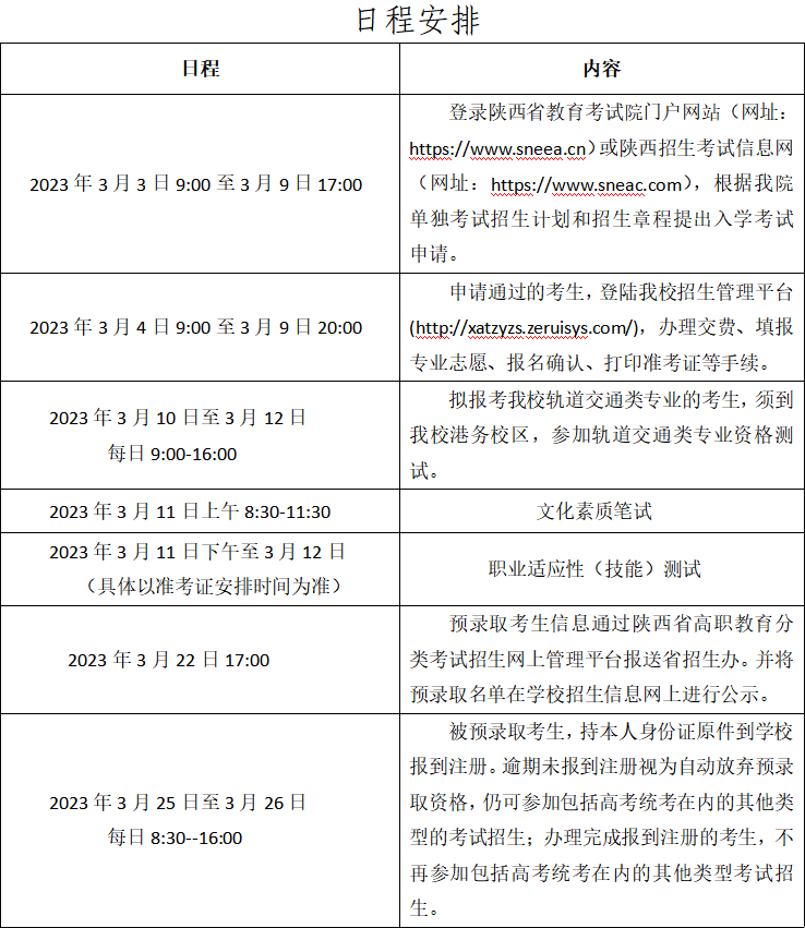 (2)申请通过的考生,须于2023年3月4日9:00至3月9日20:00,登陆我校招生管理平台(http://xatzyzs.zeruisys.com),办理交费、填报专业志愿、报名确认、打印准考证等手续。