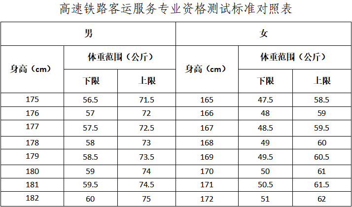四.高速铁路客运服务专业资格测试(身高、体重、身高体重比例)必须达标。